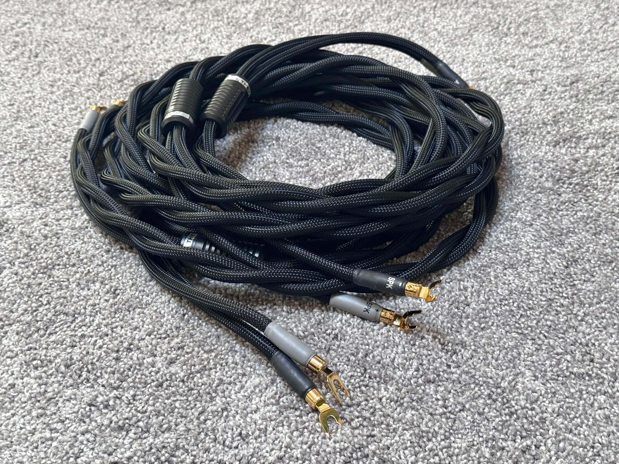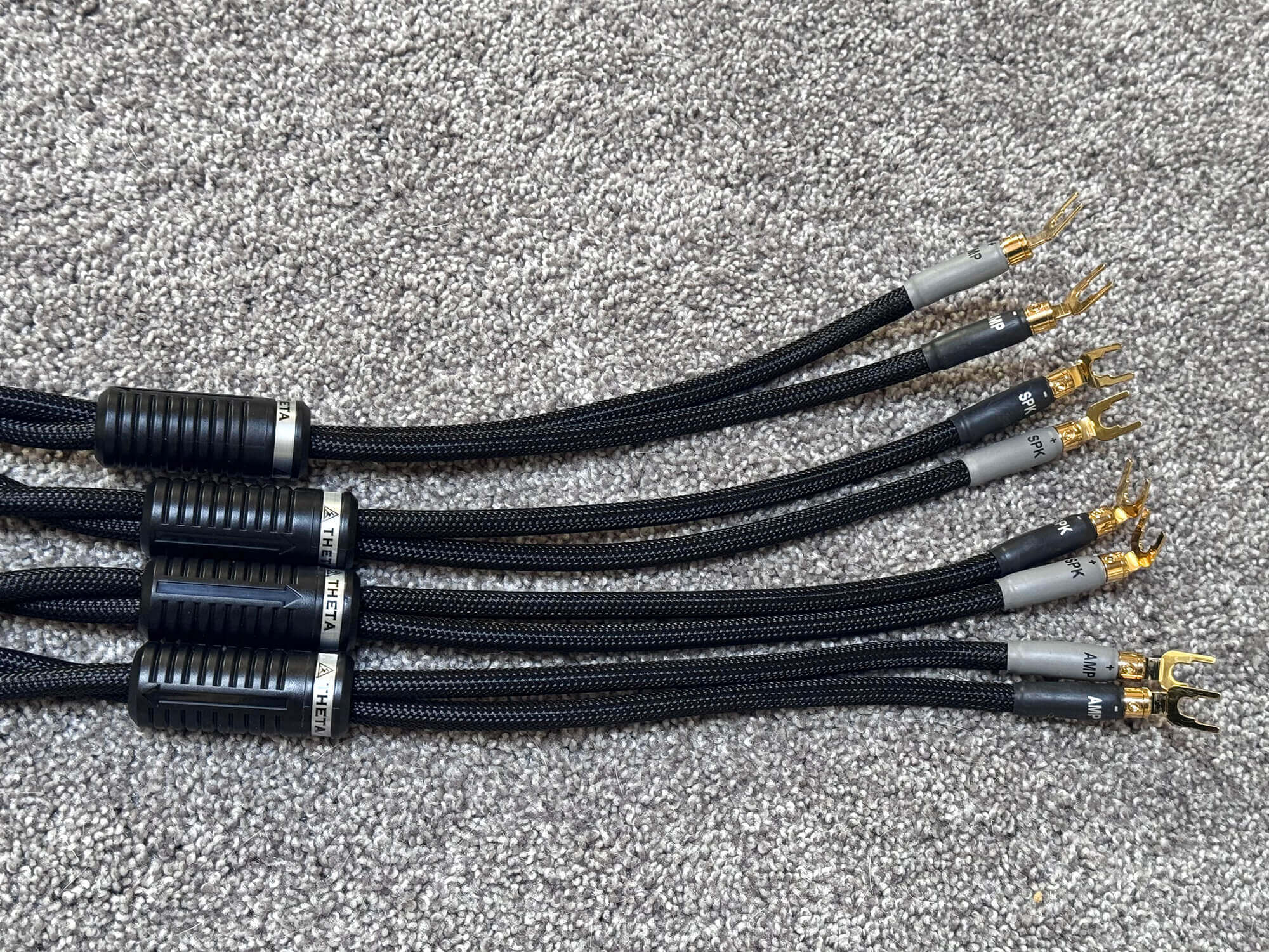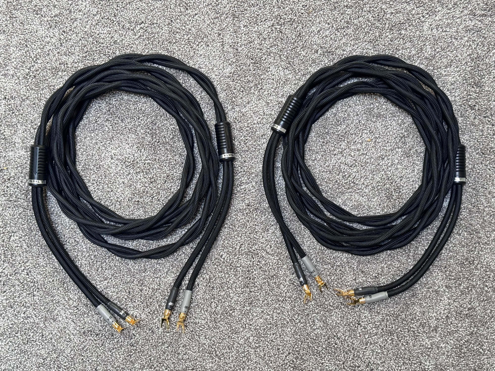 I own Bliss Hifi, and these Shunyata Theta speaker cables are in on consignment from one of my local clients. They are 4M in length and terminated with high quality angled gold spades on both sides. They’ve only been installed and removed once, so the connectors are in excellent condition and the cables are in perfect working order.