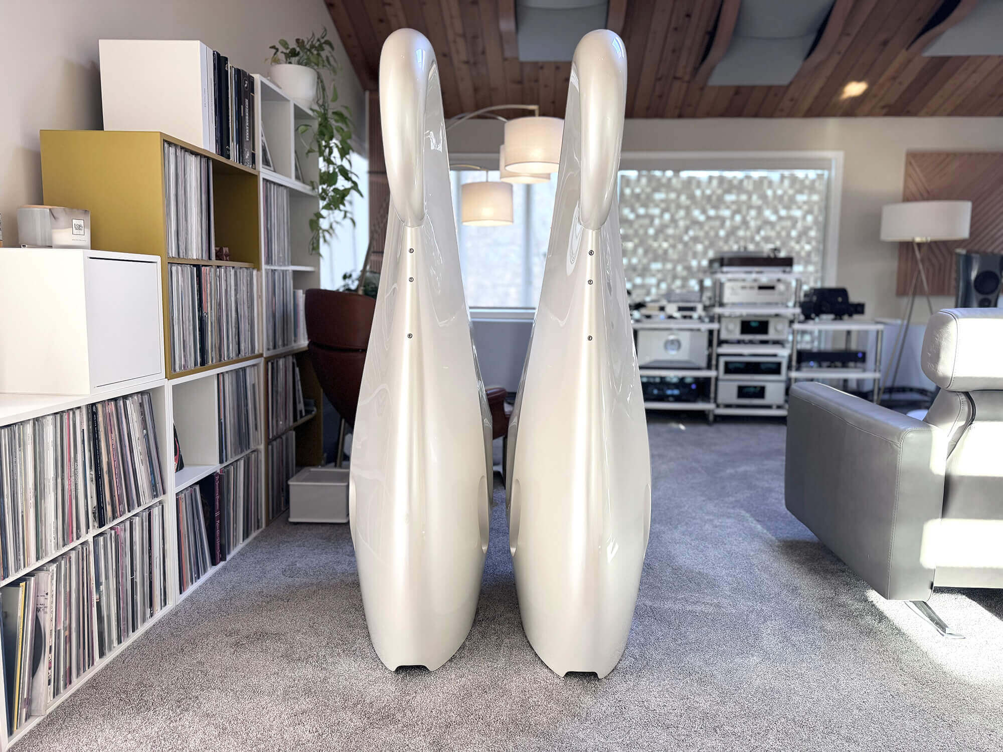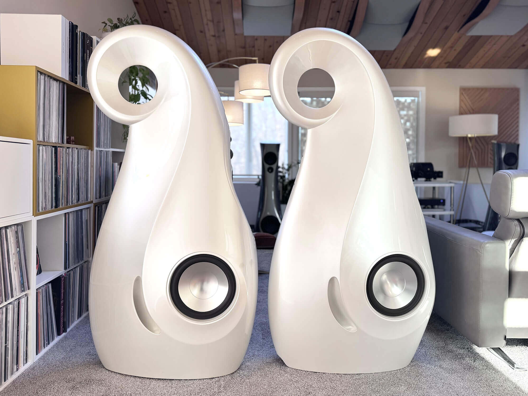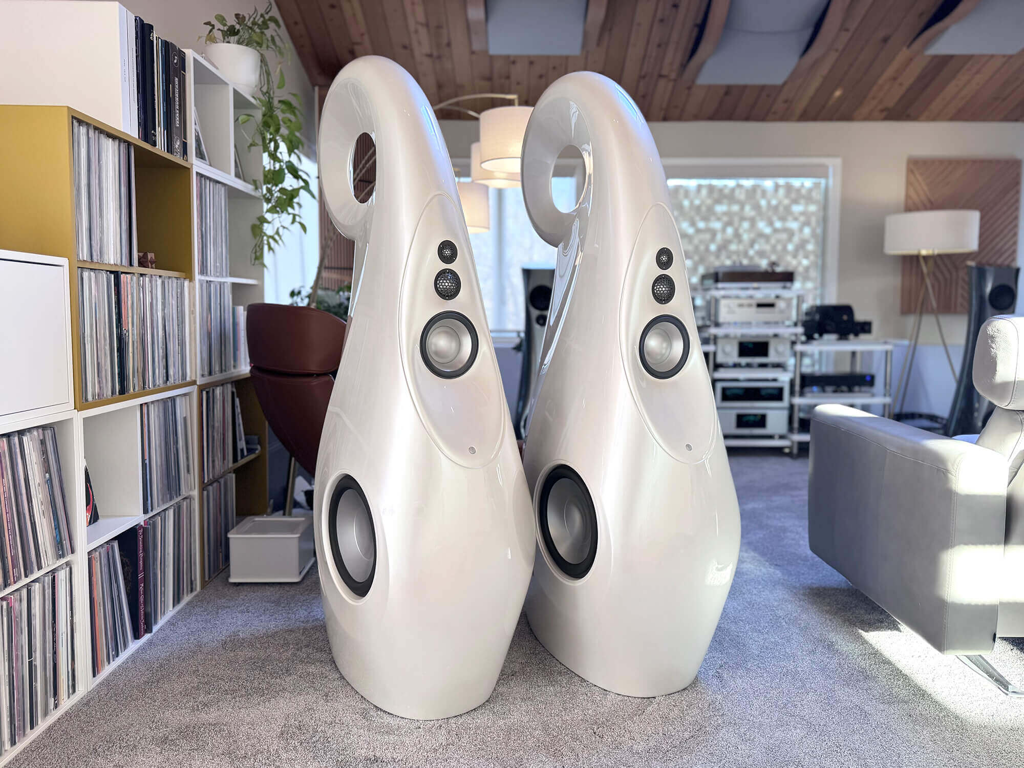 Experience loudspeaker engineering liberated from the constraints of the conventional box with the Vivid Audio Giya G1 Spirit, the flagship creation of Laurence Dickie—the legendary designer responsible for the iconic Bowers & Wilkins Nautilus, arguably the most influential loudspeaker of the modern era. The Spirit represents the culmination of Dickie’s lifelong obsession with eliminating cabinet-induced coloration, employing a continuously curved enclosure fabricated from vacuum-infused glass-reinforced composite with an end-grain balsa core—a construction so light yet rigid that the 180-liter cabinet weighs under 70 kilograms despite standing over five feet tall. Every driver is loaded by Vivid’s patented Tapered Tube technology, with logarithmically tapered subenclosures hidden within the organic form that absorb rear-wave energy across the entire frequency spectrum, eliminating the resonances that plague conventional designs. The five proprietary drivers—all designed and assembled in-house—feature aluminum-alloy diaphragms with catenary-profile domes (the mathematically optimal shape discovered through finite element analysis, pushing first breakup modes well above the audible range), while twin opposed woofers employ Vivid’s Reaction Cancelling Compliant Mount that mechanically links them to neutralize cabinet vibration. Reviewers describe the Spirit as capable of playing “louder and freer than anything” they’ve heard, with one noting it could “go places no other speaker would dare go”—delivering the majesty and scale of any music with all its texture and detail intact.