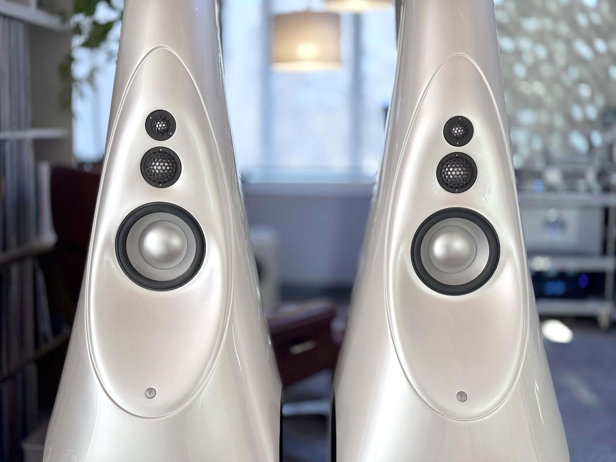 I own Bliss Hifi, a high-end audio boutique and authorized Vivid Audio dealer, and these Vivid Audio Giya G1 Spirit Floor Standing Speakers are being listed as a consignment sale. The speakers are finished in the pearl white option, which is quite beautiful in ways pictures cannot do justice. The speakers are in perfect working order, but there are visible cosmetic issues, all on one speaker. While they are noticeable from some angles more than others, the speakers still present beautifully overall and sound absolutely stellar. Please see photos for details. I can also send videos upon request.